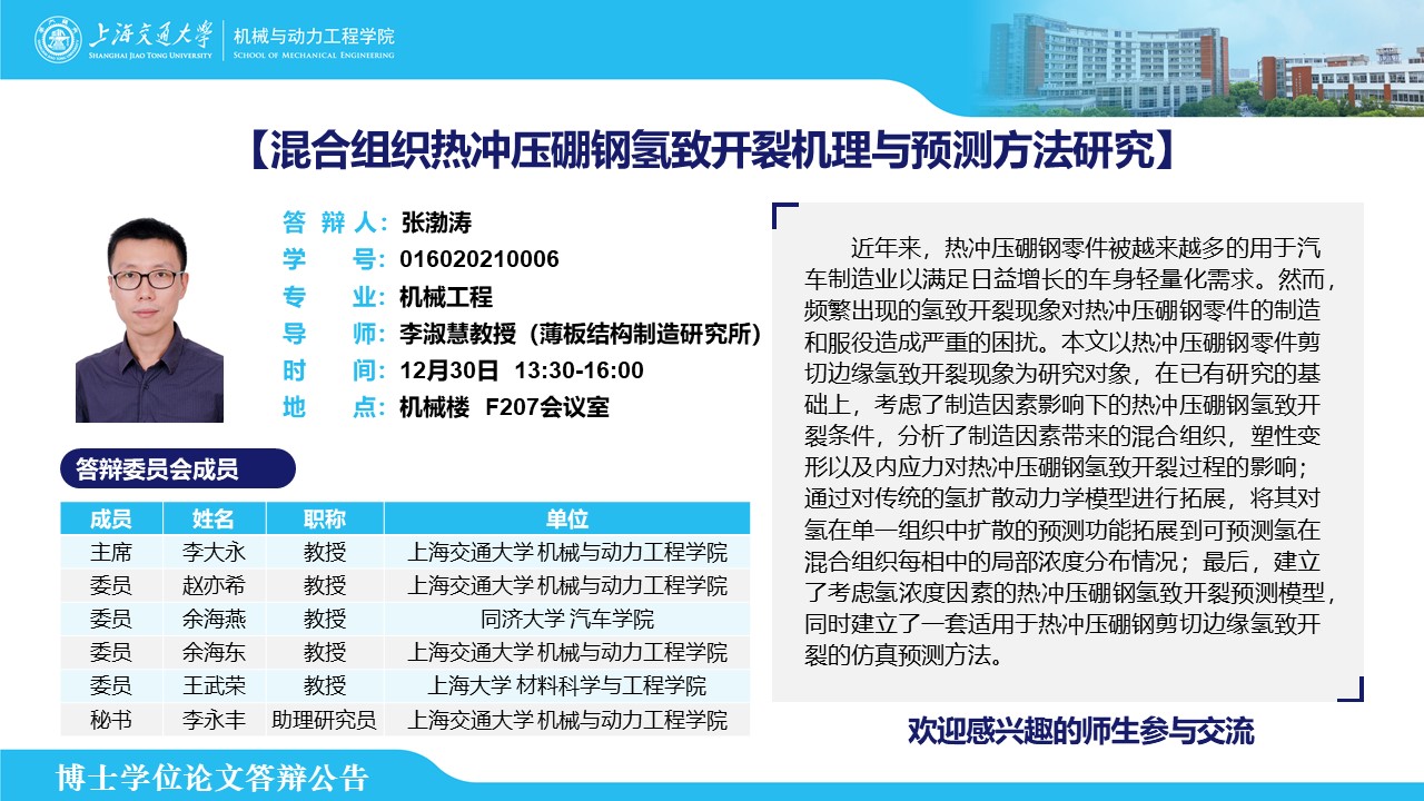 答辩人:张渤涛 | 导师:李淑慧 | 时间:12月30日 13:30-16:00 | 地点:机械楼 F207会议室