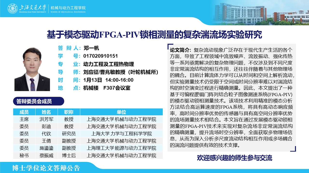 答辩人:邓一帆 | 导师:刘应征 曹兆敏 | 时间:1月13日 14:00-16:00 | 地点:机械楼 F307会议室