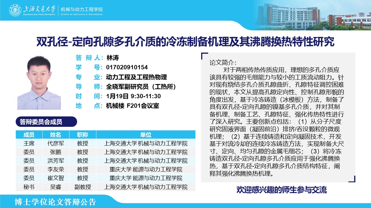 答辩人:林涛 | 导师:全晓军 | 时间:1月19日 9:30-11:30 | 地点:机械楼 F201会议室