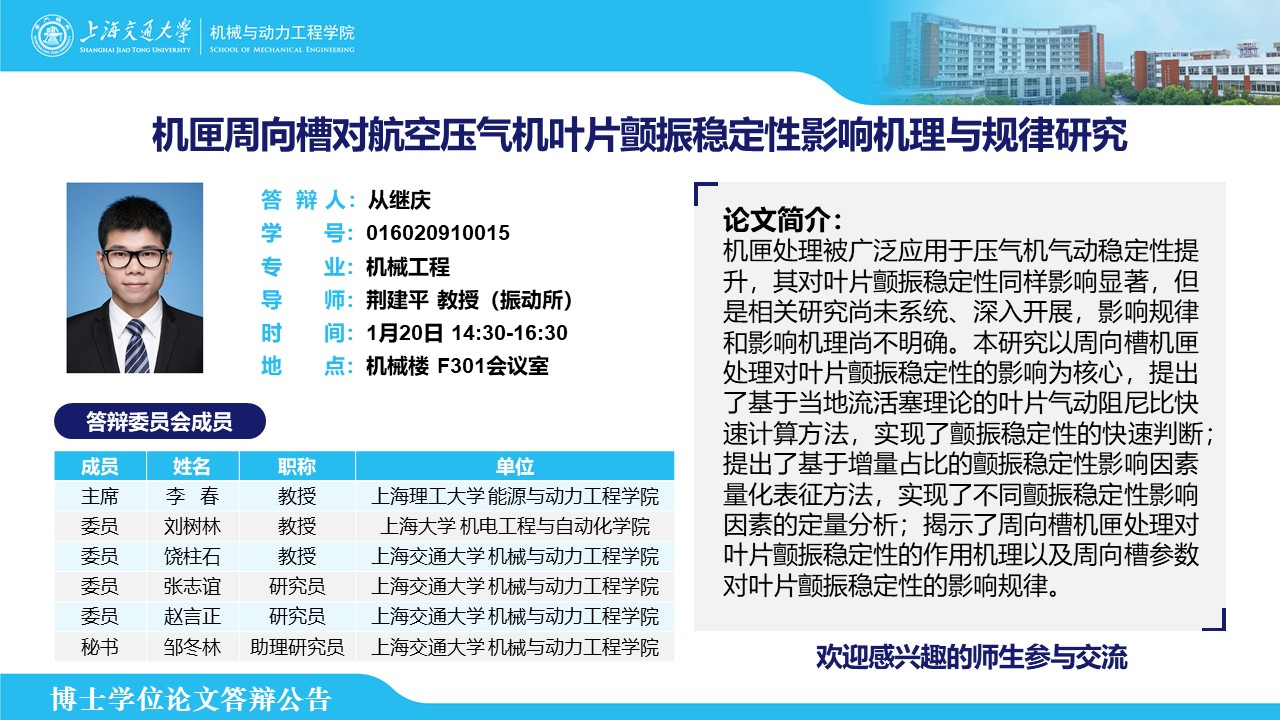 答辩人:从继庆 | 导师:荆建平 | 时间:1月20日 14:30-16:30 | 地点:机械楼 F301会议室