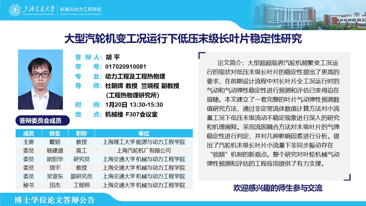 答辩人:胡平 | 导师:杜朝辉 竺晓程 | 时间:1月20日 13:30-15:30 | 地点:机械楼 F307会议室