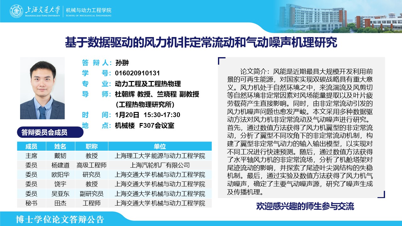 答辩人:孙翀 | 导师:杜朝辉 竺晓程 | 时间:1月20日 15:30-17:30 | 地点:机械楼 F307会议室