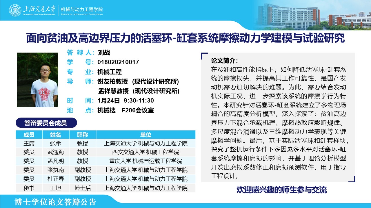 答辩人:刘战 | 导师:谢友柏 孟祥慧 | 时间:1月24日 9:30-11:30 | 地点:机械楼 F206会议室