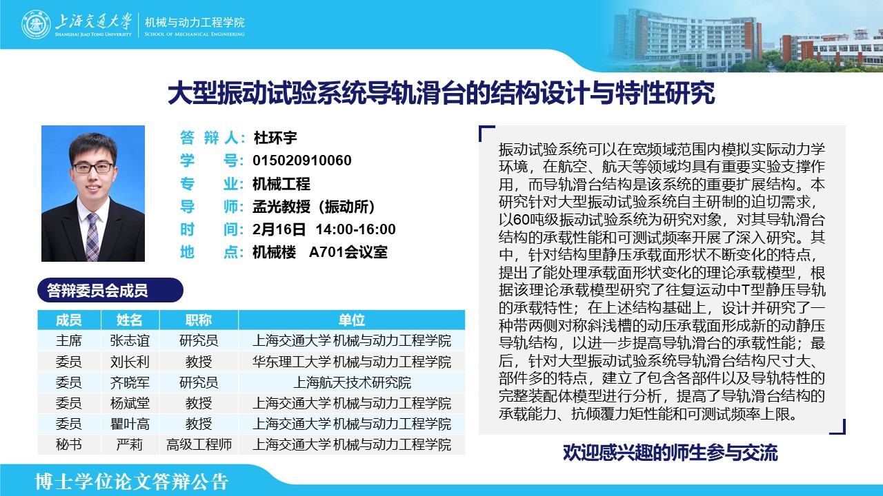 答辩人:杜环宇 | 导师:孟光 | 时间:2月16日 14:00-16:00 | 地点:机械楼 A701会议室