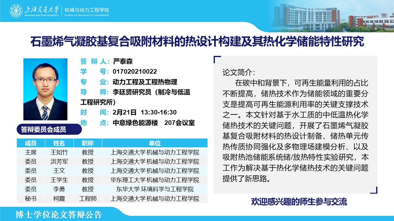 答辩人:严泰森| 导师:李廷贤 | 时间:2月21日 13:30-16:30 | 地点:中意绿色能源楼 207会议室