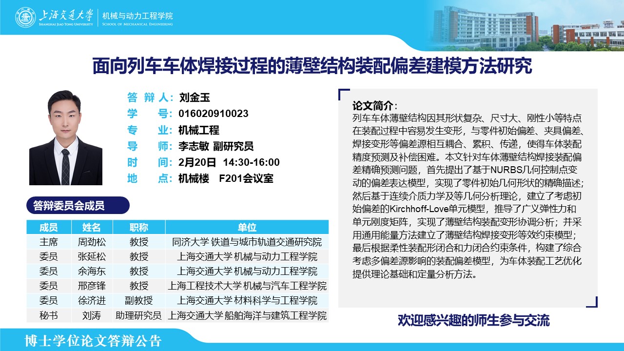答辩人:刘金玉| 导师:李志敏 | 时间:2月20日 14:30-16:00 | 地点:机械楼 F201会议室