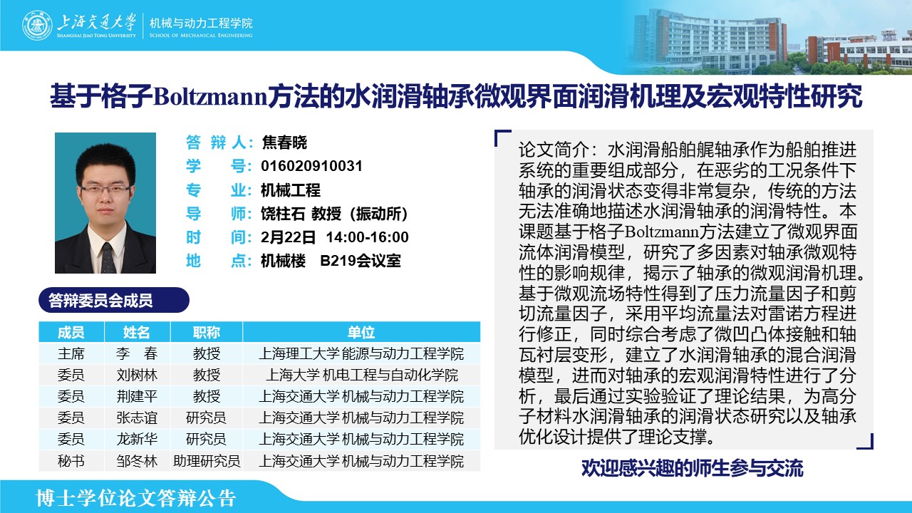 答辩人:焦春晓| 导师:饶柱石 | 时间:2月22日 14:00-16:00 | 地点:机械楼 B219会议室