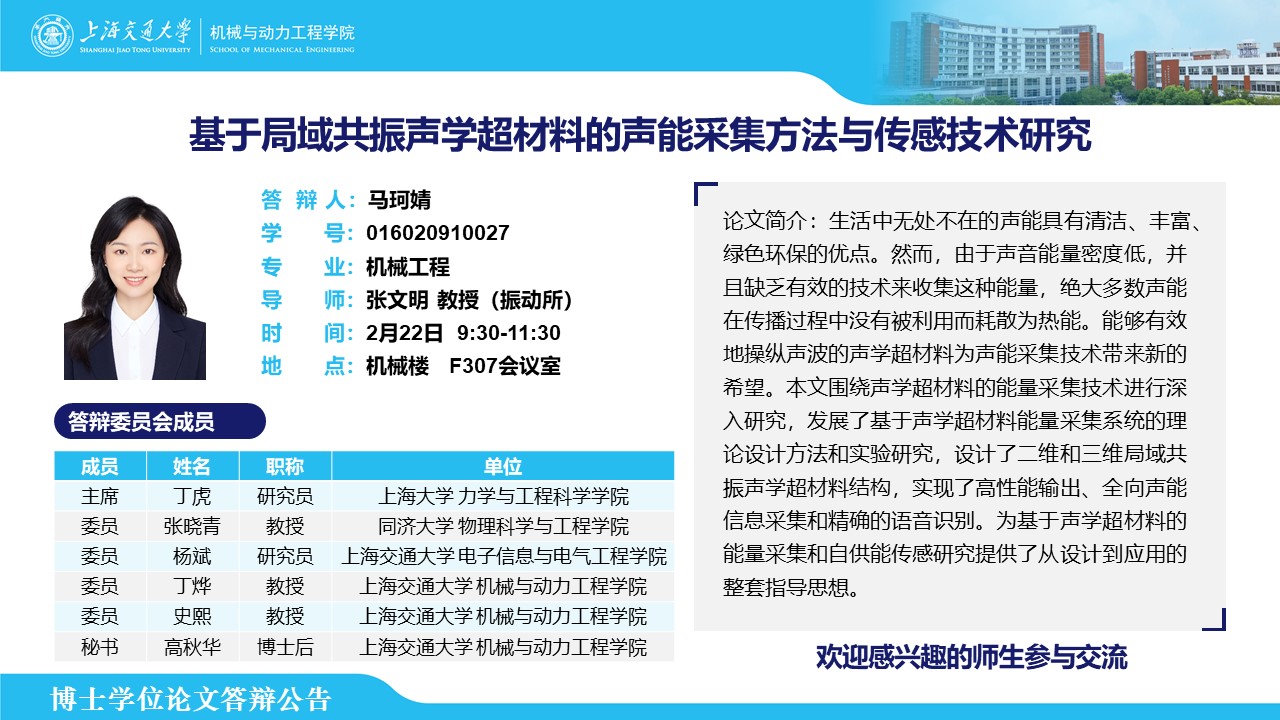 答辩人:马珂婧| 导师:张文明 | 时间:2月22日 9:30-11:30 | 地点:机械楼 F307会议室