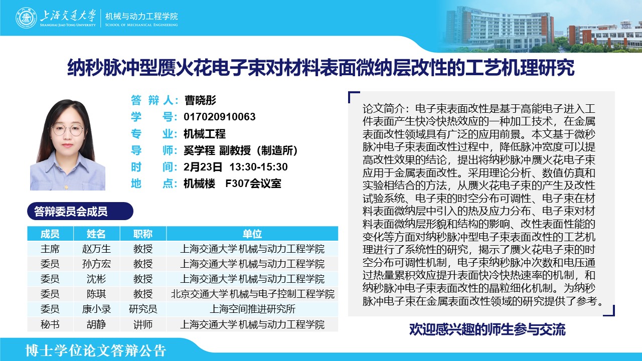 答辩人:曹晓彤| 导师:奚学程 | 时间:2月23日 13:30-15:30 | 地点:机械楼 F307会议室