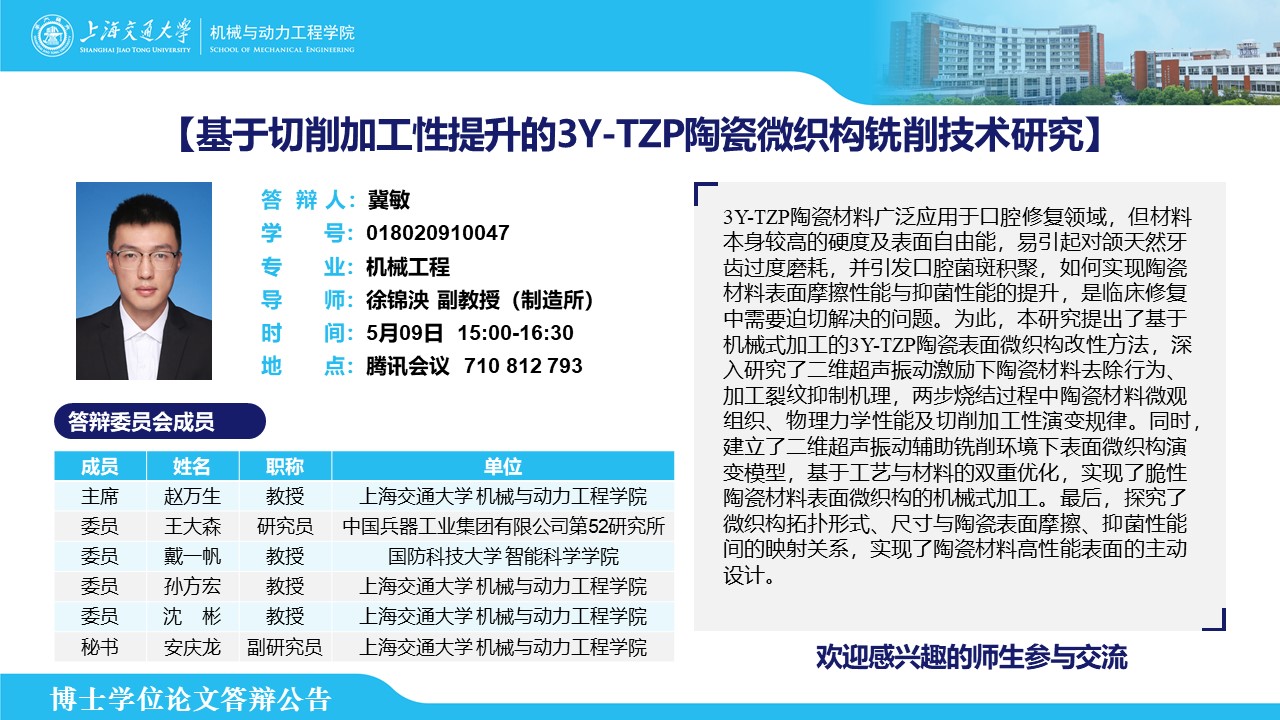 答辩人:冀敏 | 导师:徐锦泱 | 时间:5月9日 15:00-16:30 | 腾讯会议号码:710812793