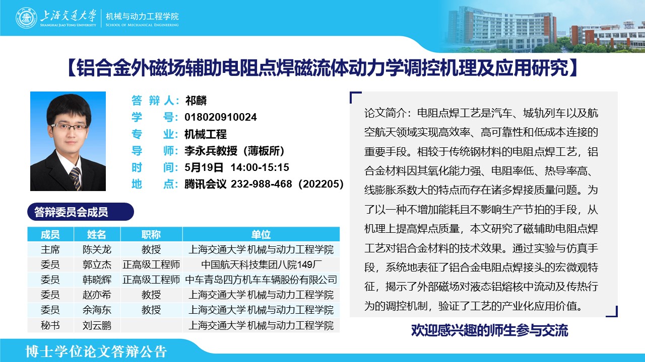 答辩人:祁麟 | 导师:李永兵 | 时间:5月19日 14:00-15:15 | 腾讯会议号码:232988468 会议密码:202205
