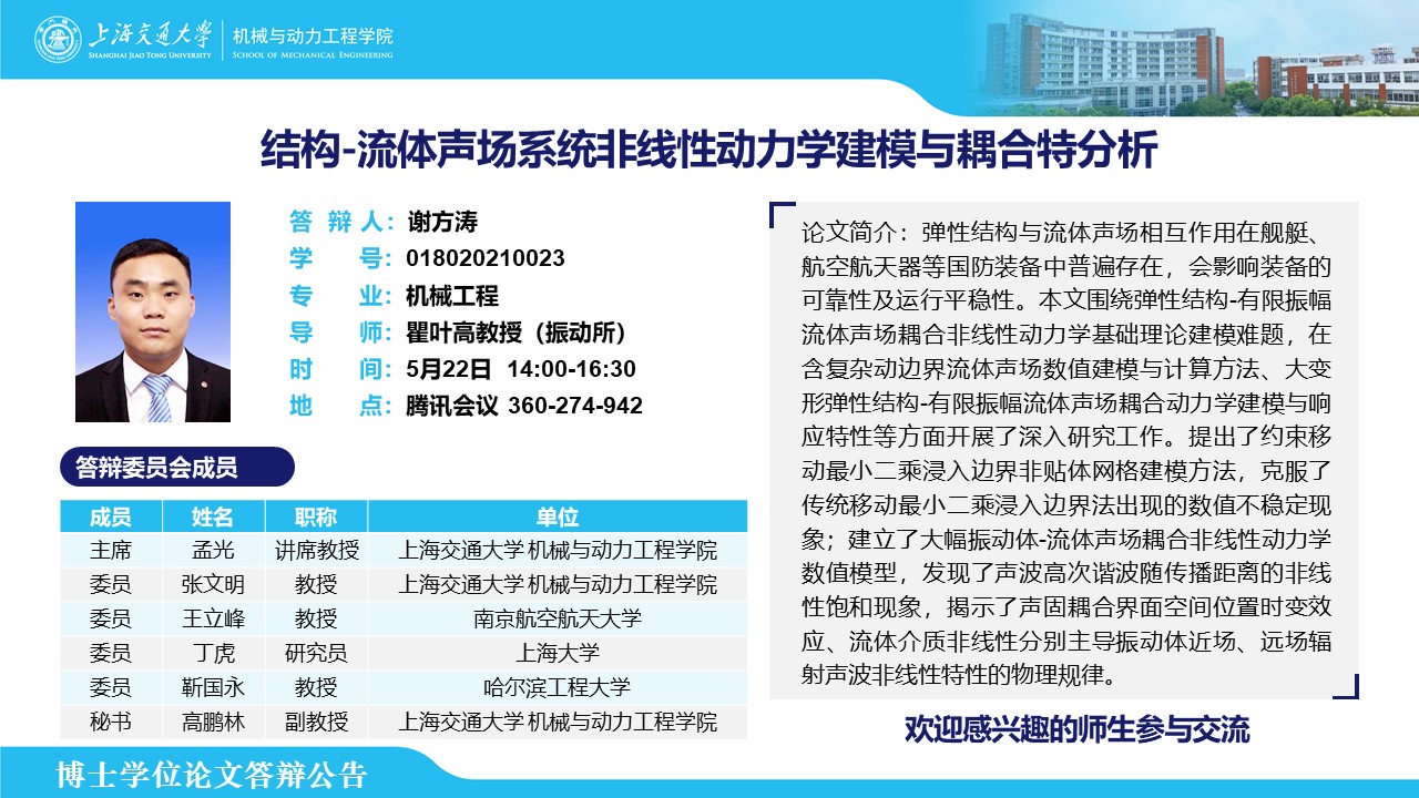 答辩人:谢方涛 | 导师:瞿叶高 | 时间:5月22日 14:00-16:30 | 腾讯会议号码:360274942