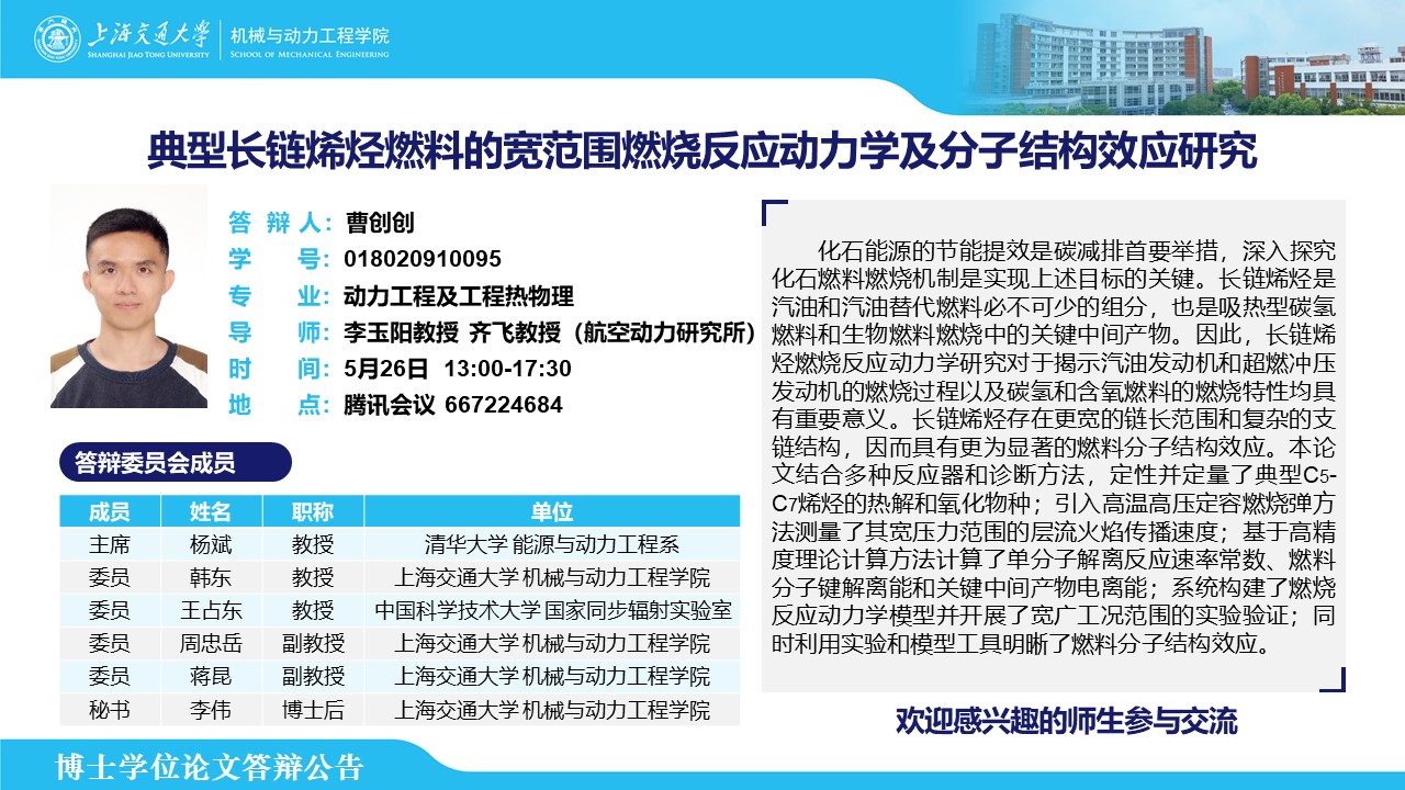 答辩人:曹创创 | 导师:李玉阳 齐飞 | 时间:5月26日 13:00-17:30 | 腾讯会议号码:667224684