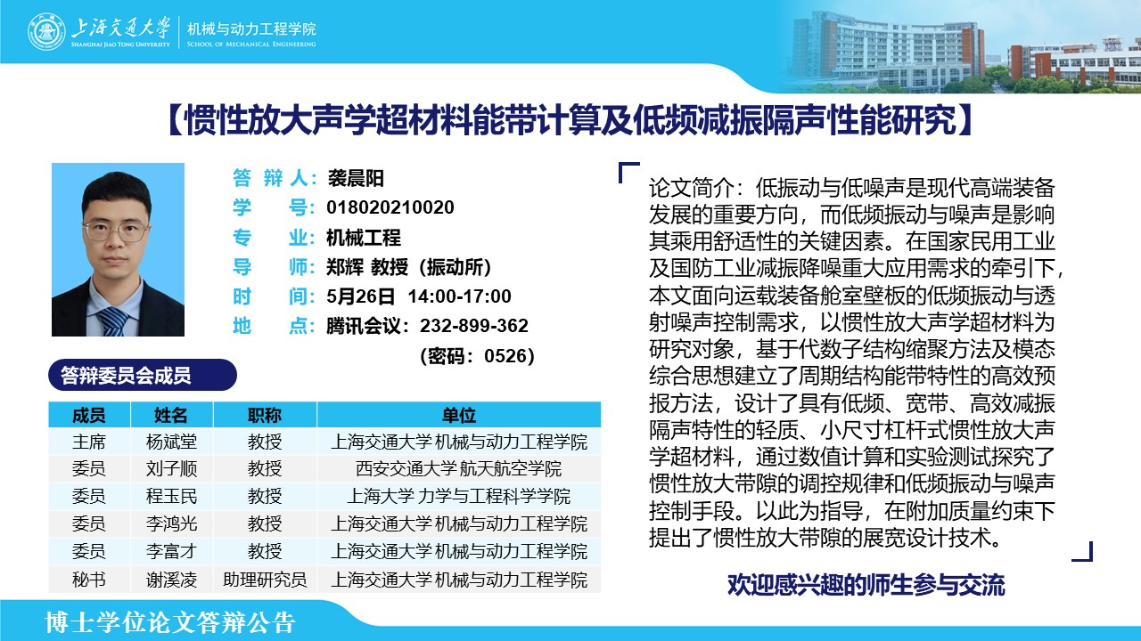 答辩人:袭晨阳 | 导师:郑辉 | 时间:5月26日 14:00-17:00 | 腾讯会议号码:232899362 参会密码:0526