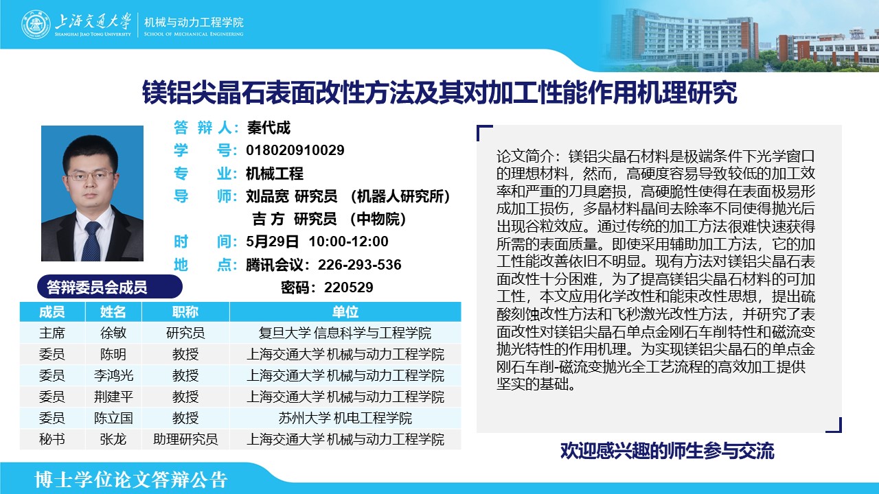 答辩人:秦代成 | 导师:刘品宽 吉方 | 时间:5月29日 10:00-12:00 | 腾讯会议号码:226293536 参会密码:220529