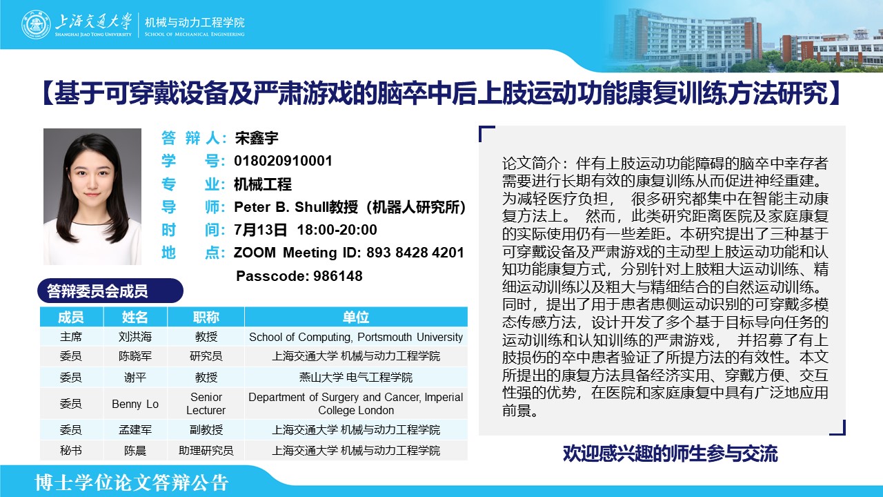 答辩人:宋鑫宇 | 导师:Peter B. Shull | 时间:7月13日 18:00-20:00 | ZOOM会议号:89384284201 密码:986148