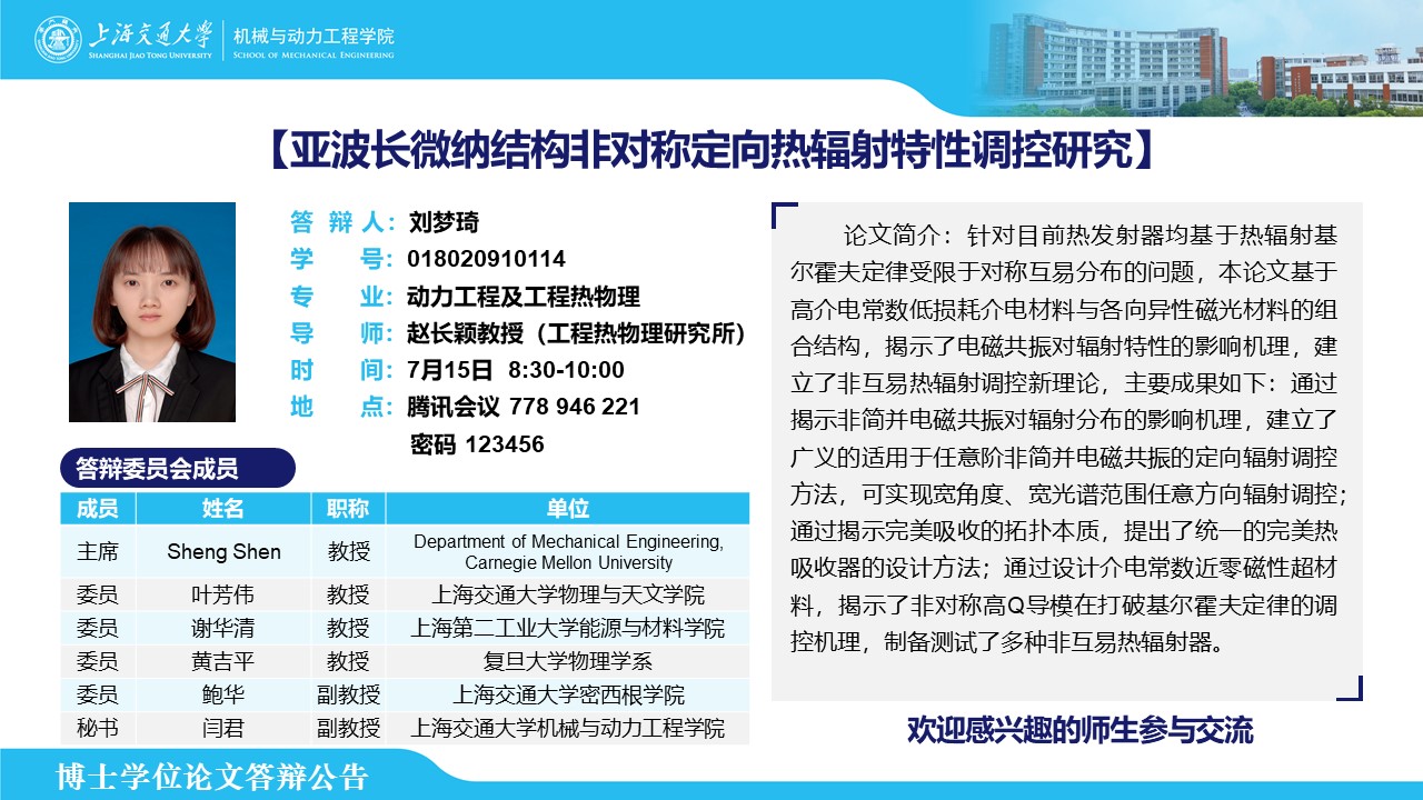 答辩人:刘梦琦 | 导师:赵长颖 | 时间:7月15日 8:30-10:00 | 腾讯会议号:778946221 密码:123456