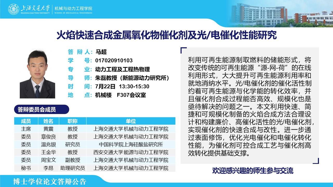 答辩人:马超 | 导师:朱磊 | 时间:7月22日 13:30-15:30 | 地点:机械楼 F307会议室