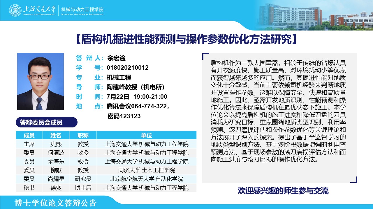 答辩人:余宏淦 | 导师:陶建峰 | 时间:7月22日 19:00-21:00 | 腾讯会议会议号:664774322 密码:123123