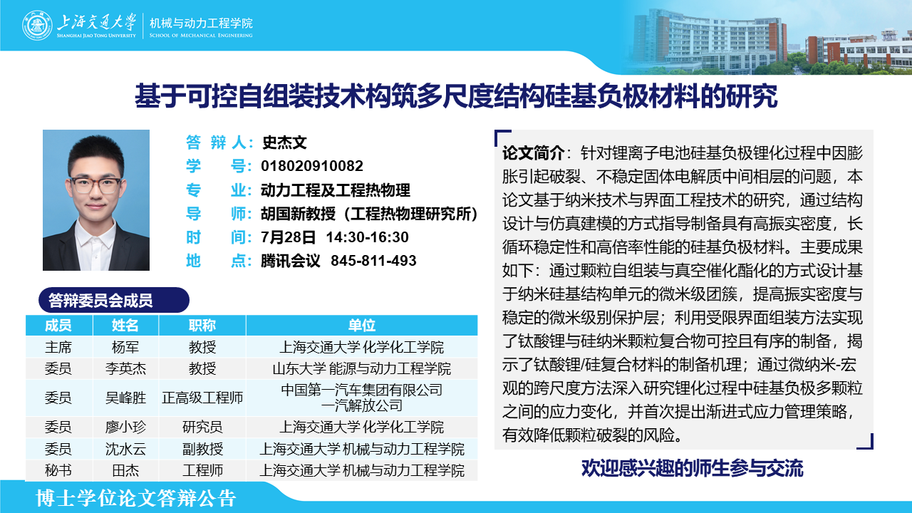 答辩人:史杰文 | 导师:胡国新 | 时间:7月28日 14:30-16:30 | 腾讯会议会议号:845811493