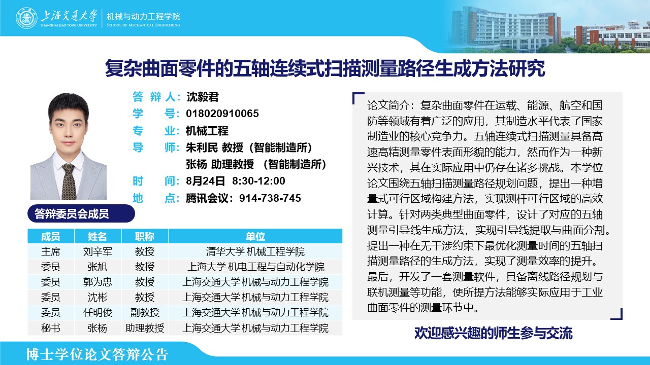 答辩人:沈毅君 | 导师:朱利民、张杨 | 时间:8月24日 8:30-12:00 | 腾讯会议会议号:914738745