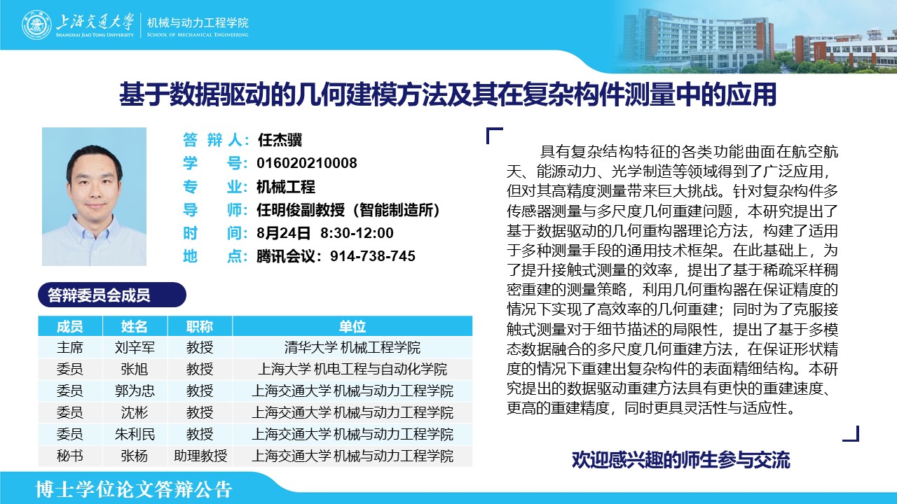 答辩人:任杰骥 | 导师:任明俊 | 时间:8月24日 8:30-12:00 | 腾讯会议会议号:914738745