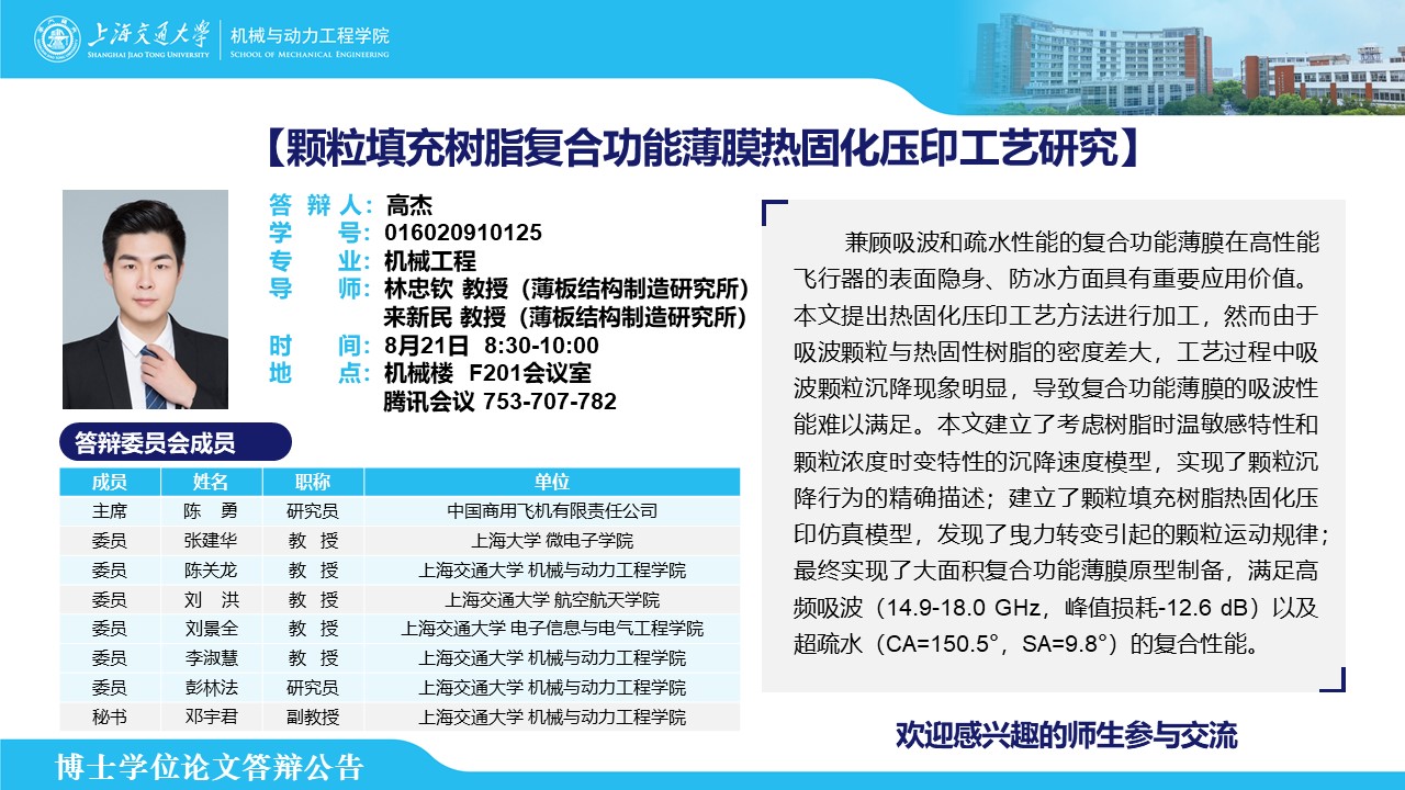 答辩人:高杰 | 导师:林忠钦、来新民 | 时间:8月21日 8:30-10:00 | 地点:机械楼F201会议室 腾讯会议会议号:753707782