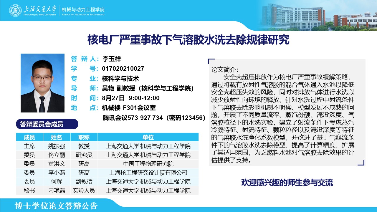 答辩人:李玉祥 | 导师:吴艳 | 时间:8月27日 9:00-12:00 | 地点:机械楼F301会议室 腾讯会议会议号:573927734 密码:123456