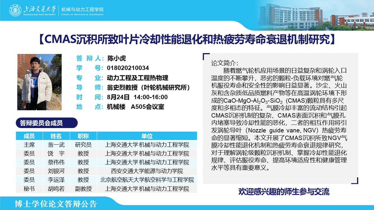答辩人:陈小虎 | 导师:翁史烈 | 时间:8月24日 14:00-16:00 | 地点:机械楼 A505会议室