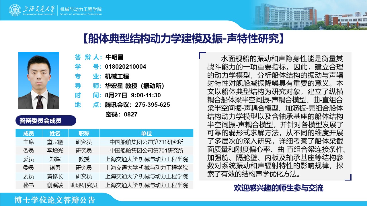 答辩人:牛明昌 | 导师:华宏星 | 时间:8月27日 9:00-11:30 | 地点:275395625 密码:0827