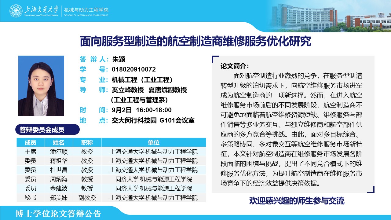 答辩人:朱颖 | 导师:奚立峰、夏唐斌 | 时间:9月2日 16:00-18:00 | 地点:交大闵行科技园 G101会议室