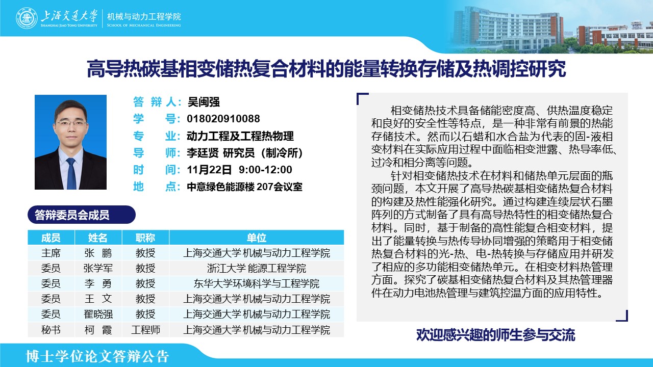答辩人:吴闽强 | 导师:李廷贤 | 时间:11月22日 9:00 – 12:00 | 地点:中意绿色能源楼 207会议室