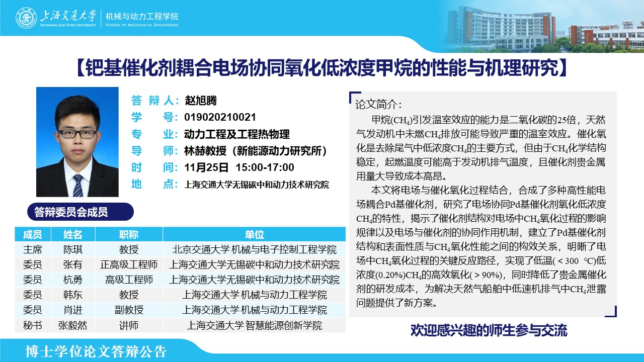 答辩人:赵旭腾 | 导师:林赫 | 时间:11月25日 15:00 – 17:00 | 地点:上海交通大学无锡碳中和动力技术研究院