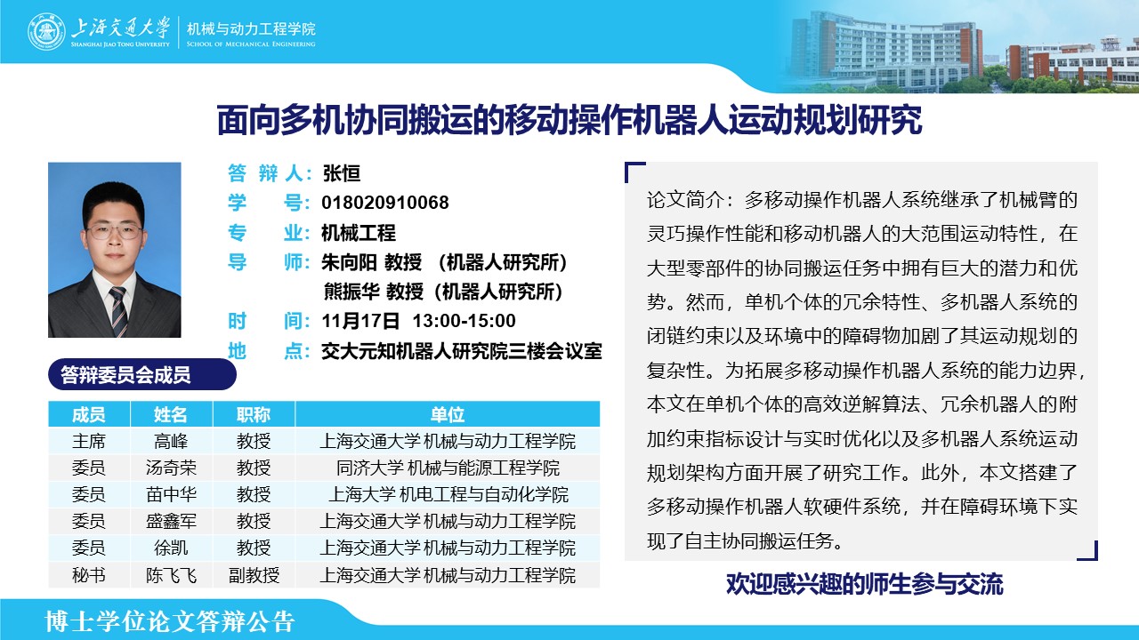 答辩人:张恒 | 导师:朱向阳、熊振华 | 时间:11月17日 13:00 – 15:00 | 地点:交大元知机器人研究院三楼会议室