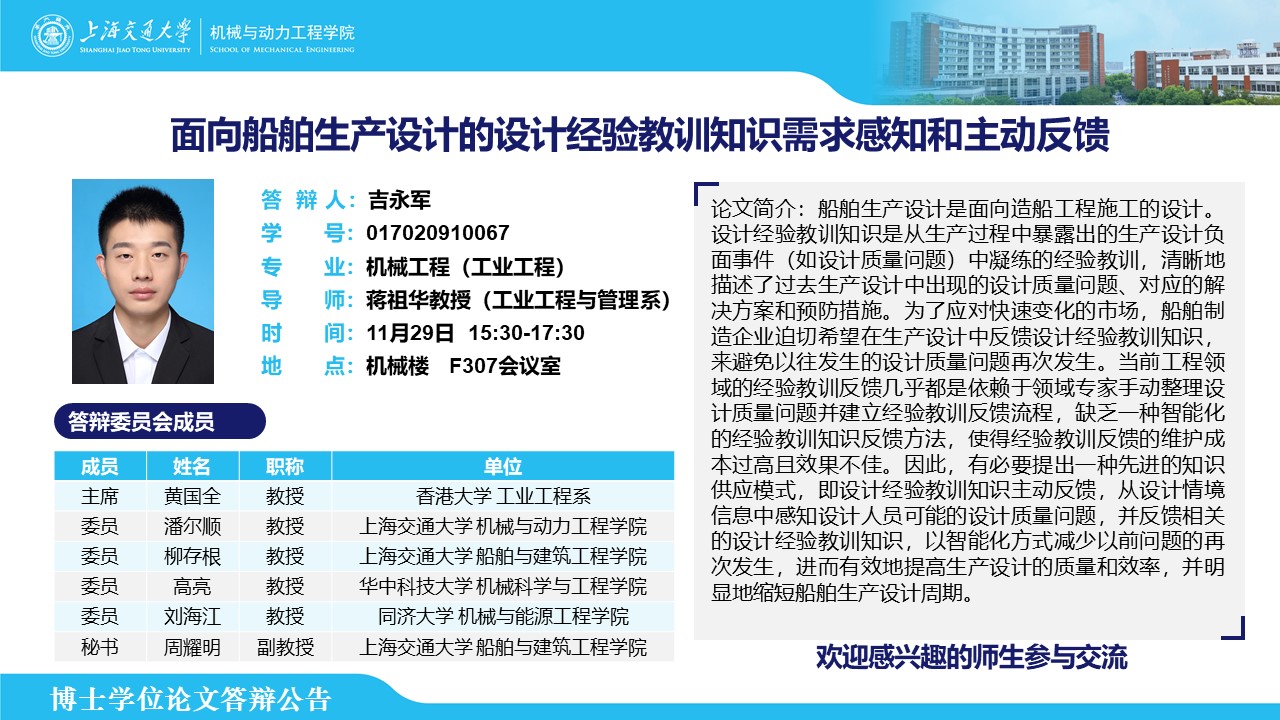 答辩人:吉永军 | 导师:蒋祖华| 时间:11月29日 15:30 – 17:30 | 地点:机械楼 F307会议室
