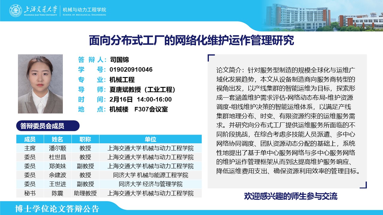 答辩人:司国锦 | 导师:夏唐斌| 时间:2月16日 14:00-16:00 |地点:机械楼 F307会议室