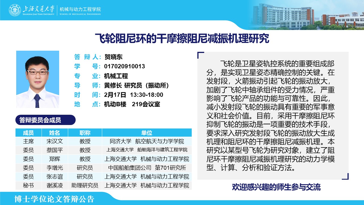 答辩人:贺晓东 | 导师:黄修长 | 时间:2月17日 13:30-18:00 |地点:机动B楼 219会议室