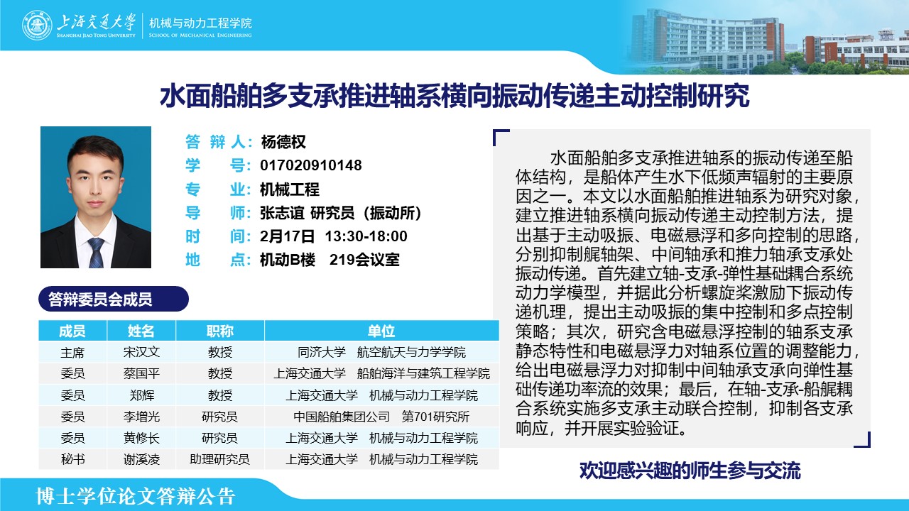 答辩人:杨德权 | 导师:张志谊 | 时间:2月17日 13:30-18:00 |地点:机动B楼 219会议室