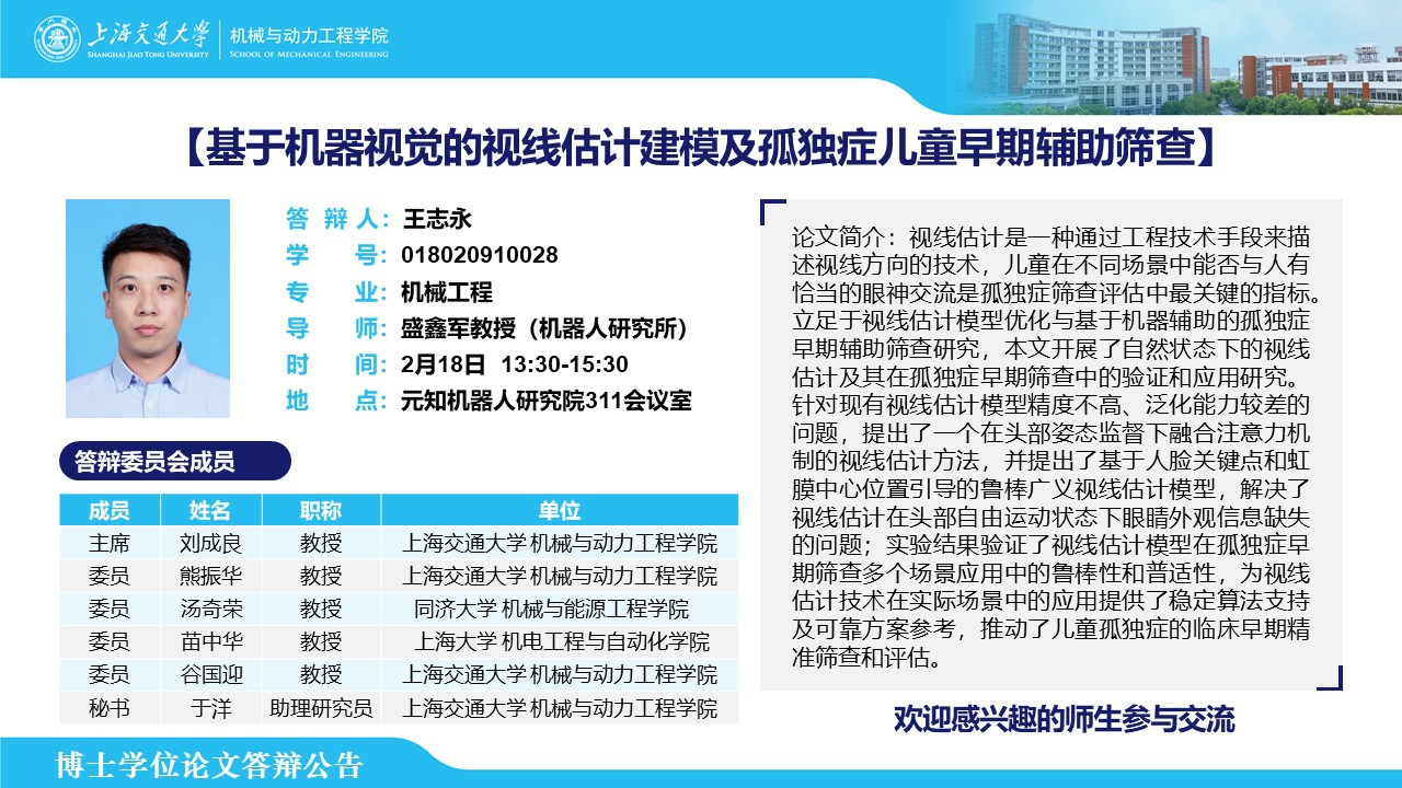 答辩人:王志永 | 导师:盛鑫军| 时间:2月18日 13:30-15:30 |地点:元知机器人研究院311会议室