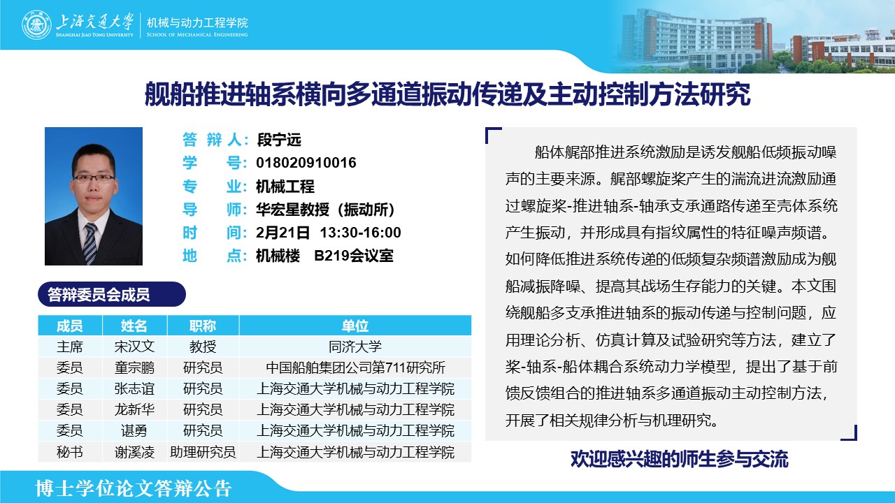 答辩人:段宁远 | 导师:华宏星| 时间:2月21日 13:30-16:00 |地点:机械楼 B219会议室