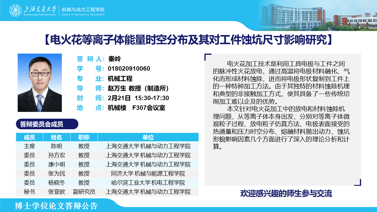 答辩人:秦岭 | 导师:赵万生| 时间:2月21日 15:30-17:30 |地点:机械楼 F307会议室