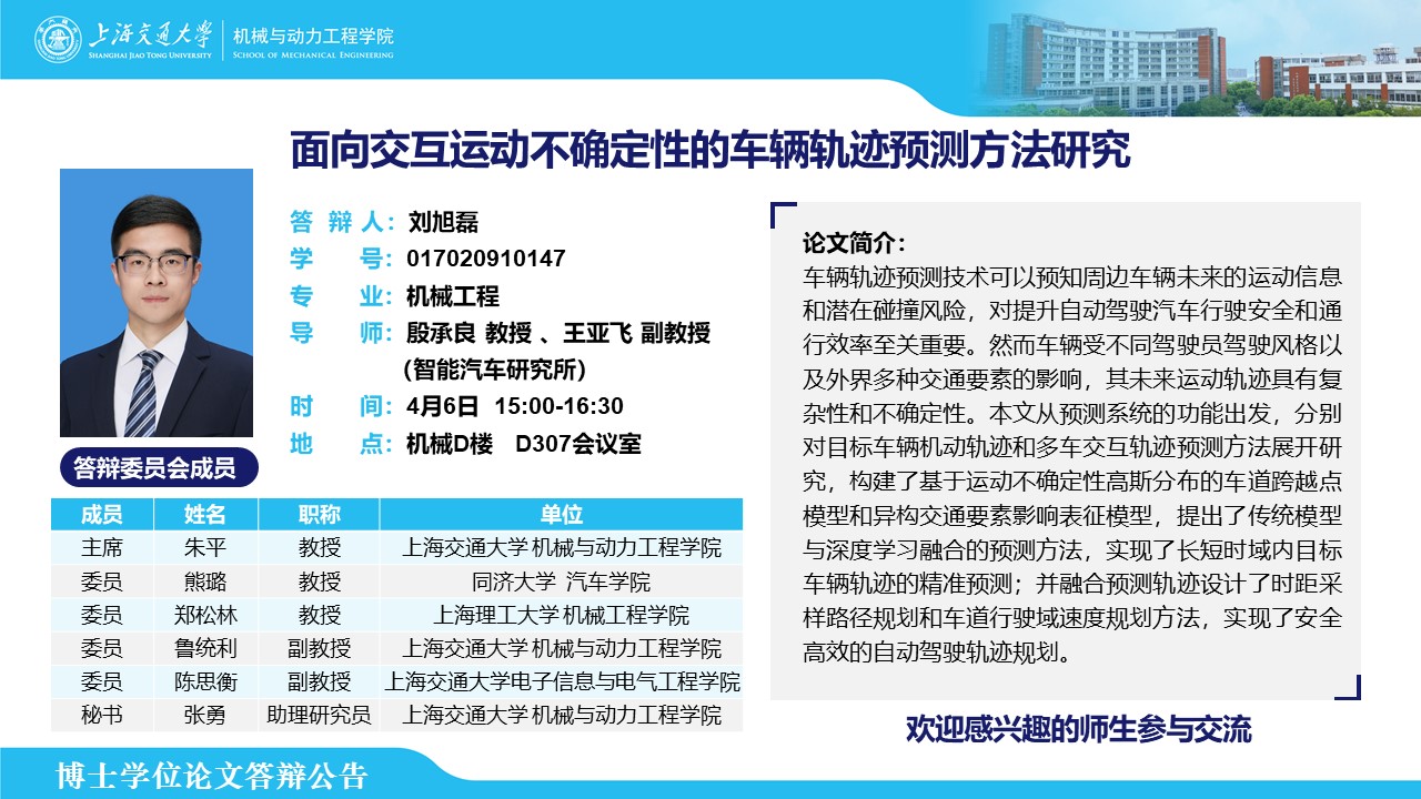 答辩人:刘旭磊 | 导师:殷承良、王亚飞 | 时间:4月6日 15:00 – 16:30 | 地点:机械D楼 D307会议室