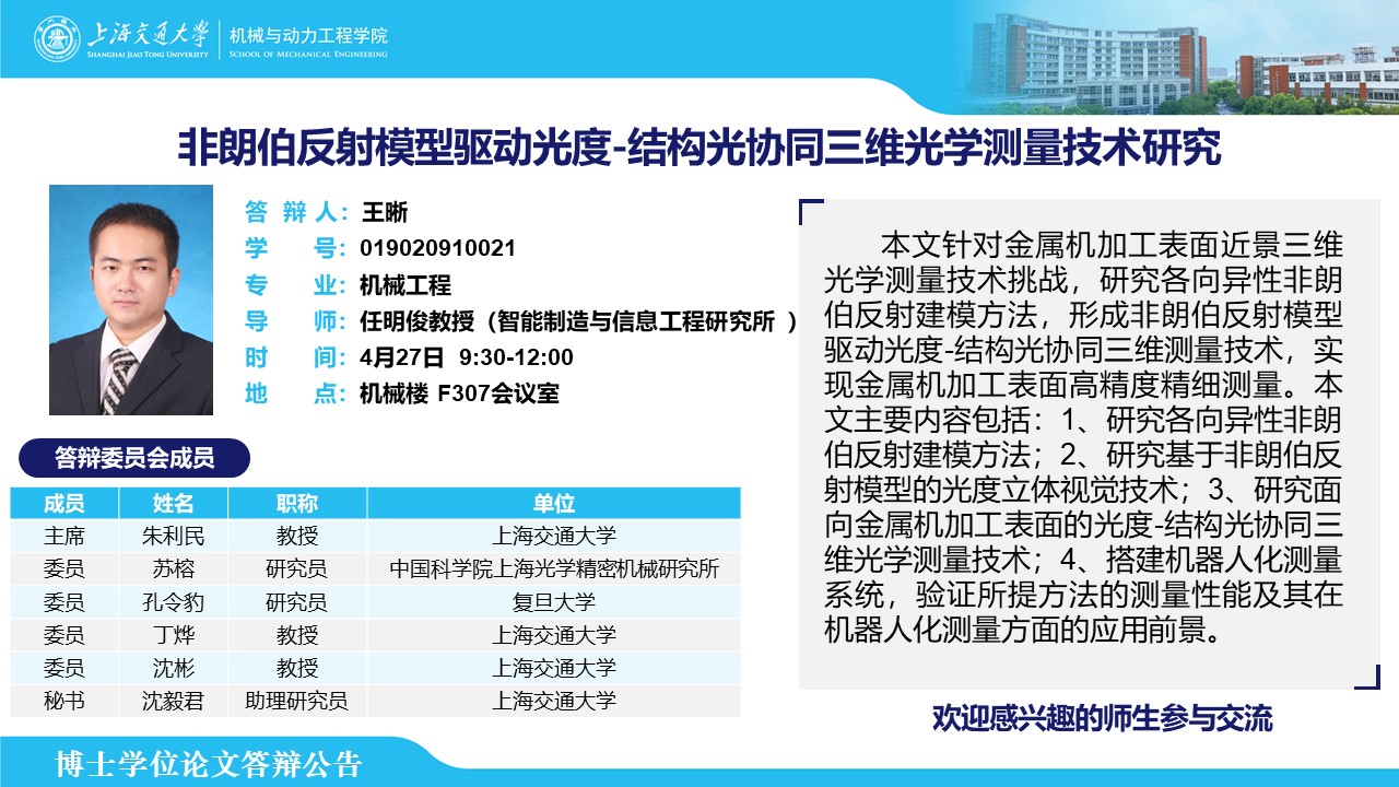 答辩人:王晰 | 导师:任明俊 | 时间:4月27日 9:30 – 12:00 | 地点:机械楼 F307会议室