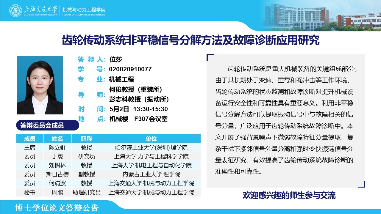 答辩人:位莎 | 导师:何俊、彭志科 | 时间:5月2日 13:30 – 15:30 | 地点:机械楼 F307会议室