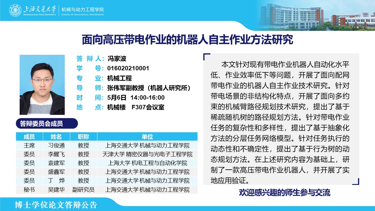 答辩人:冯家波 | 导师:张伟军 | 时间:5月6日 14:00 – 16:00 | 地点:机械楼 F307会议室