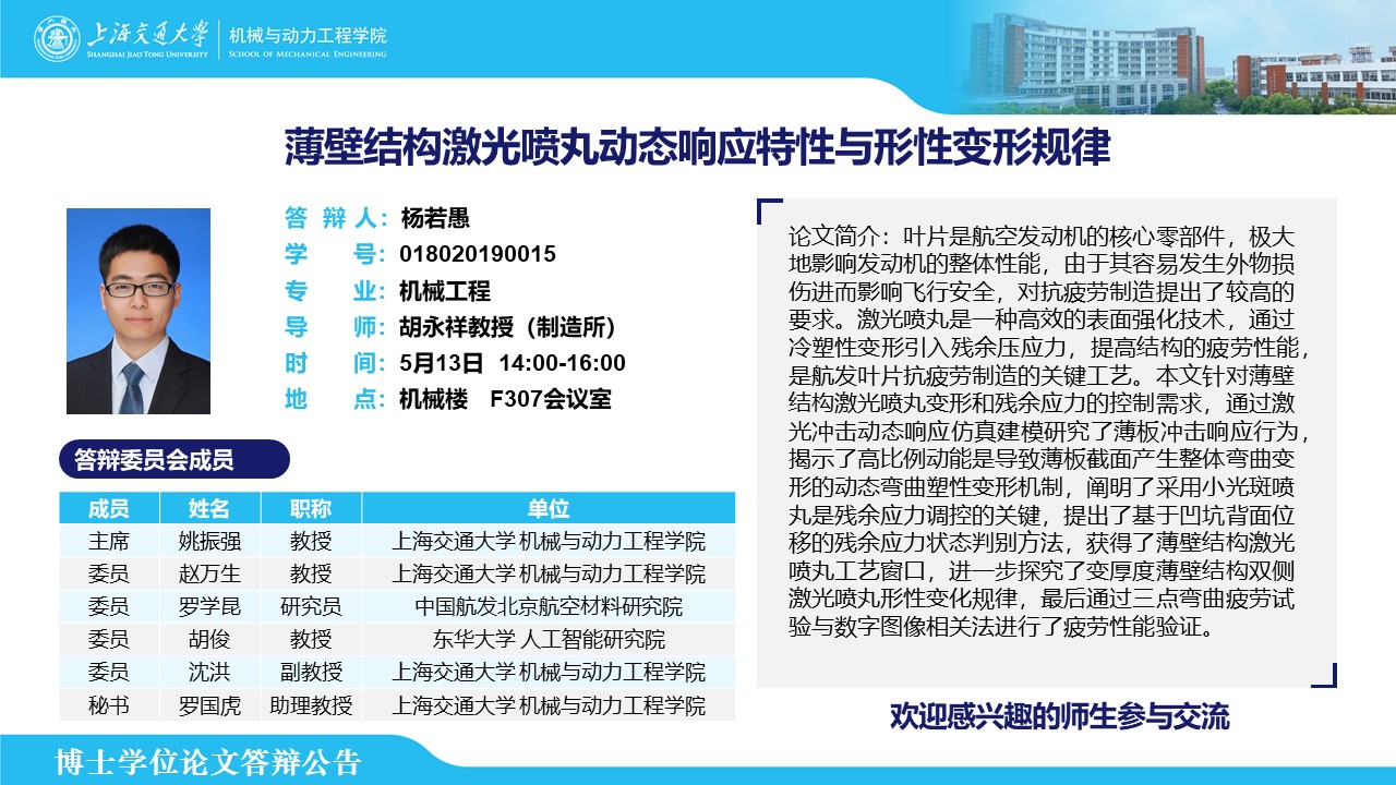 答辩人:杨若愚 | 导师:胡永祥 | 时间:5月13日 14:00 – 16:00 | 地点:机械楼 F307会议室