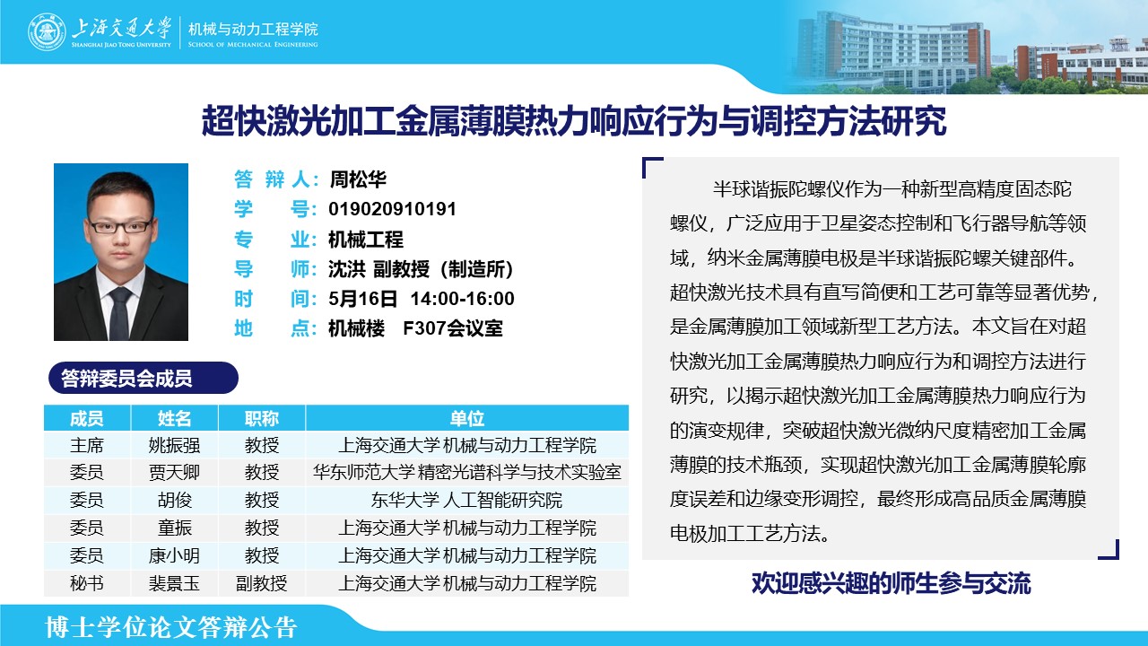 答辩人:周松华| 导师:沈洪 | 时间:5月16日 14:00 – 16:00 | 地点:机械楼 F307会议室