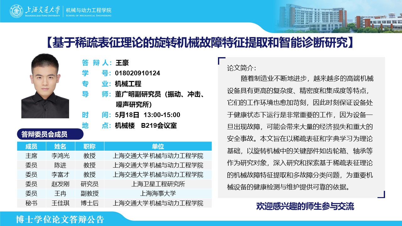 答辩人:王豪| 导师:董广明 | 时间:5月18日 13:00 – 15:00 | 地点:机械楼 B219会议室