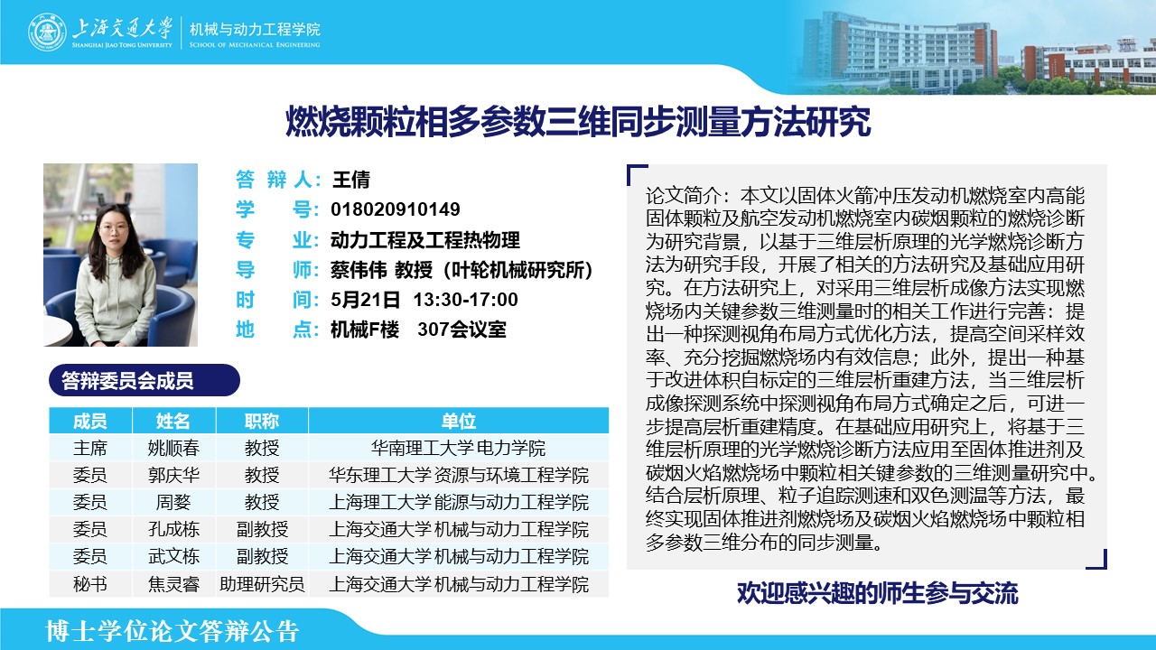 答辩人:王倩| 导师:蔡伟伟 | 时间:5月21日 13:30 – 17:00 | 地点:机械F楼 307会议室