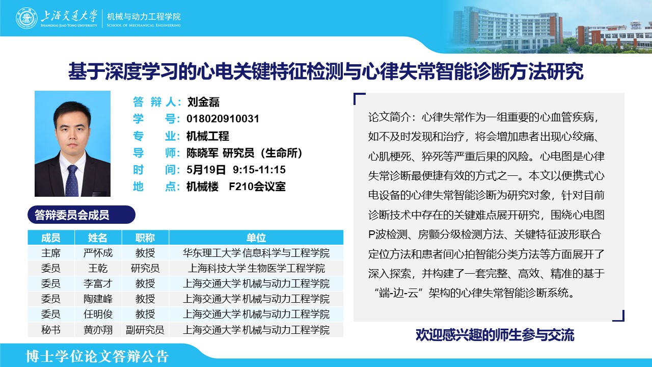 答辩人:刘金磊| 导师:陈晓军 | 时间:5月19日 9:15 – 11:15 | 地点:机械楼 F210会议室